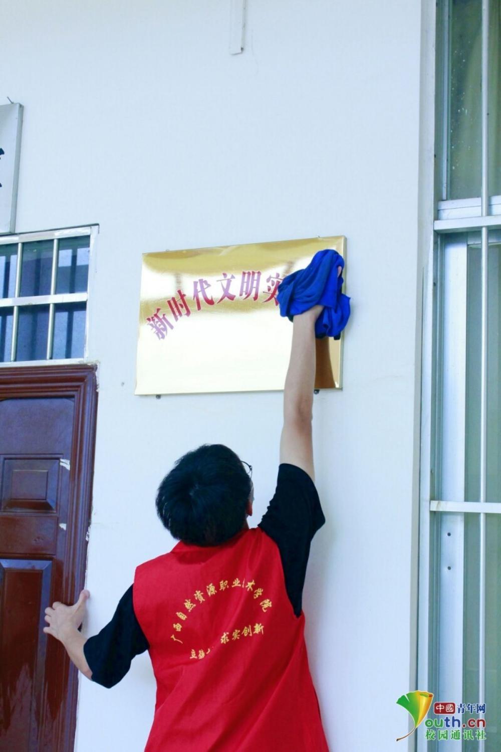 图为实践团成员在扶绥县岜盆乡乡村文化站参与整理图书与环境清扫活动。中国青年网通讯员张露供图