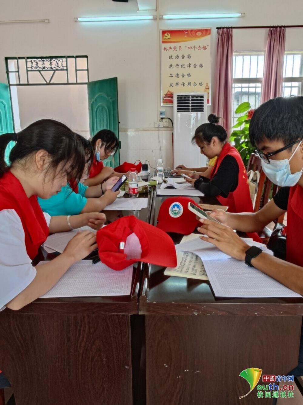 图为实践团成员在扶绥县岜盆村党群服务中心参与自建房房屋调研信息的归整与录入。中国青年网通讯员张露供图
