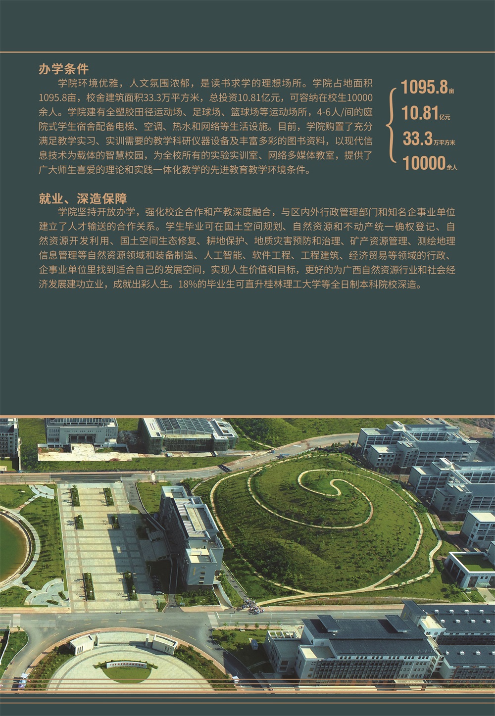 学院坚持开放办学,强化校企合作和产教深度融合,与区内外行政管理部门和知名企事业单位建立了人才输送的合作关系。学生毕业可在国土空间规划、自然资源和不动产统一确权登记、自然资源开发利用、国土空间生态修复、耕地保护、地质灾害预防和治理、矿产资源管理、测绘地理信息管理等自然资源领域和装备制造、人工智能、软件工程、工程建筑、经济贸易等领域的行政、企事业单位里找到适合自己的发展空间,实现人生价值和目标,更好的为广西自然资源行业和社会经济发展建功立业,成就出彩人生。