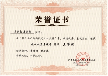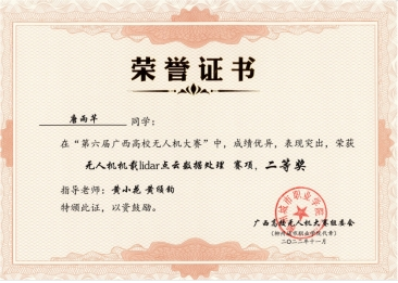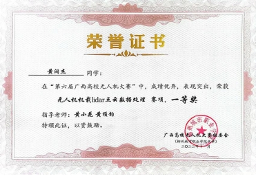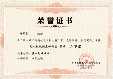 15、自然资源工程学子在第五届广西高校无人机大赛中荣获个人一等奖1项、二等奖1项。黄小花、魏荣暖两位老师荣获优秀指导教师奖。